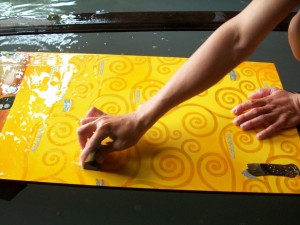 Einlegearbeiten aus künstlich gebrochenen Eierschalen oder Perlmutt werden zwischen den einzelnen Arbeitsschritten aufgebracht die dem Produkt die Einzigartigkeit und Eleganz geben, danach folgen weitere Lackschichten.