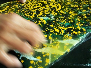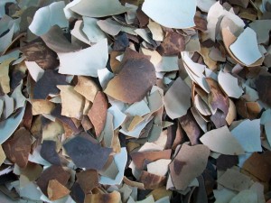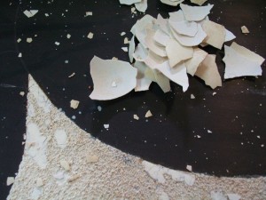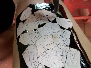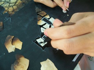 Einlegearbeiten aus künstlich gebrochenen Eierschalen oder Perlmutt werden zwischen den einzelnen Arbeitsschritten aufgebracht die dem Produkt die Einzigartigkeit und Eleganz geben, danach folgen weitere Lackschichten.